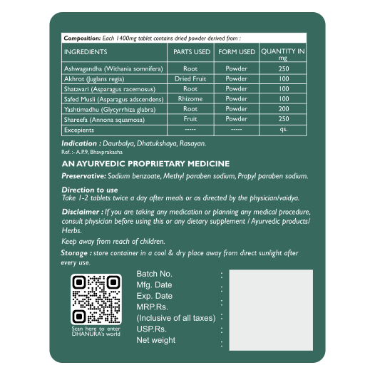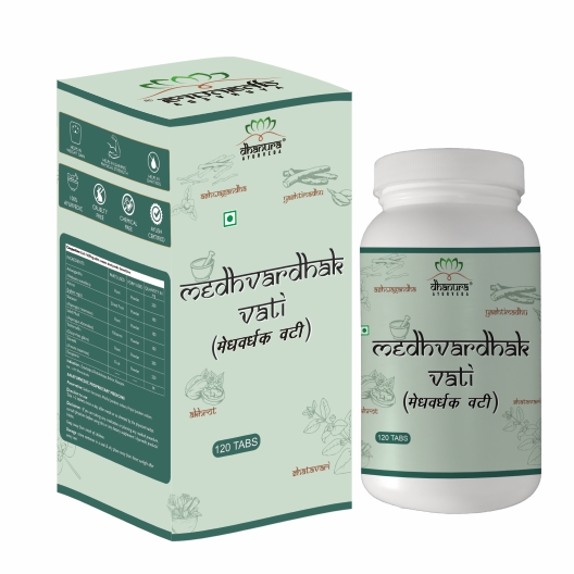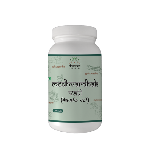 DHANURA AYURVEDA MEDHVARDHAK VATI, a powerful blend of ayurvedic herbs & spices including Ashwagandha, Akhrot, Shatavari, Safed, musli, Yashtimadhu and Shareefa. This meticulously formulated product is designed to