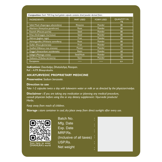 Ingredients - Safed musli (Asparagus adscendens), Akarkara (Anacyclus pyrethrum), Kaunch (Mucuna purita), Khas (Andropgon muricatus), Akhrot (Juglans regia), Ashwagandha (Withania somnifera), Gullar (Ficus glomerata), Gudhal (Hibiscus rosa sinensis), Guggul (Anacardium occidentale), Isabgol (Plantago ovata), Goksura (Tribulus terrestris).