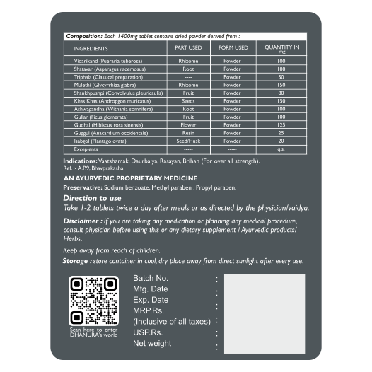 Unlock your true potential with DHANURA AYURVEDA SFURTIVARDHAK VATI. Our meticulously crafted formula combines the power of Vidarikand, Shatavar, Triphala, Mulethi,