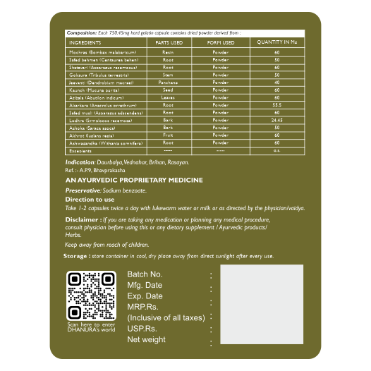 Atibala, Akarkara, Safed musli and Ashwagandha, these capsules are a natural solution for Weakness, Brain boosting and helpful in overall development for females both sexually and physically. Experience the transformative benefits of ayurveda with