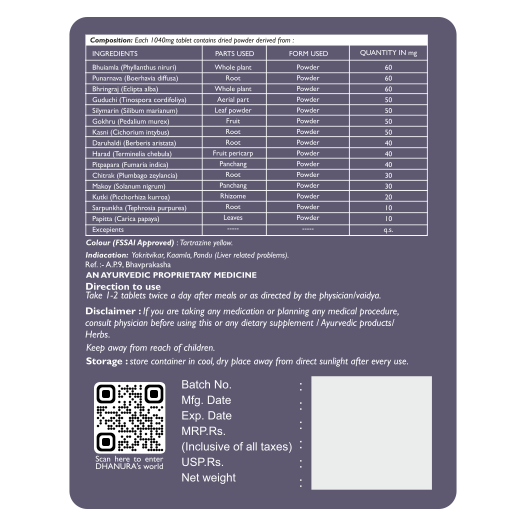 - 100% NATURAL & AYURVEDIC: -All Natural Ingredients, DHANURA AYURVEDA YAKRIT AMRIT VATI is made with natural herbs which are 100% Natural & Ayurvedic ingredients. No artificial collar or chemical are added in any of our ayurvedic products.